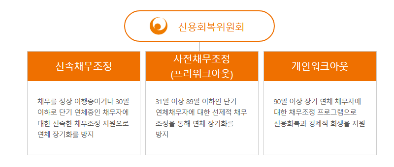 우선 신용회복위원회는 신속채무조정, 프리워크아웃, 개인워크아웃를 운영하고 있습니다. 세 종류 모두 1개 이상 금융회사의 채무가 있으며 총 채무액이 15억원 이하, 최근 6개월 내 신규 발생채무액의 30% 미만이어야 하는데요. 단지 연체기간이 30일 이하면 신속채무조정, 31일에서 89일 이하라면 프리워크아웃, 3개월 이상, 즉 90일 이상일 경우 개인워크아웃을 신청할 수 있습니다.