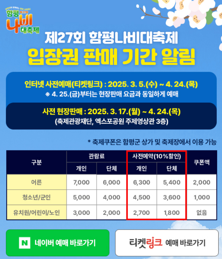 - 4. 25.(금)부터는 현장판매 요금과 동일하게 예매 가능합니다.