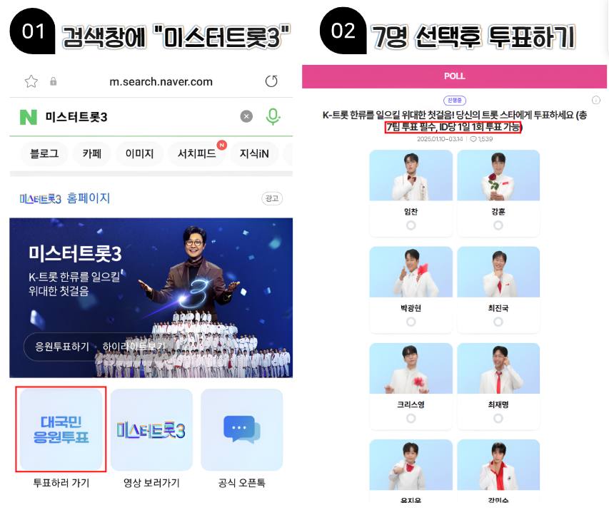 ㅇ 네이버 앱 또는 검색창에 "미스터트롯3"을 검색하시면 투표하러 가기 버튼이 보입니다. 이동후 위와 동일하게 투표 진행하시면 됩니다.