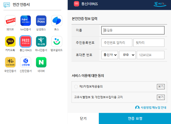 ② 간편인증을 선택 하면 민간인증서가 나옵니다. 전 pass를 선택하고 본인인증 정보 입력을 진행했어요.