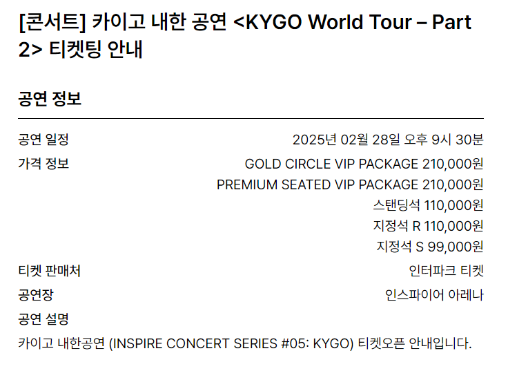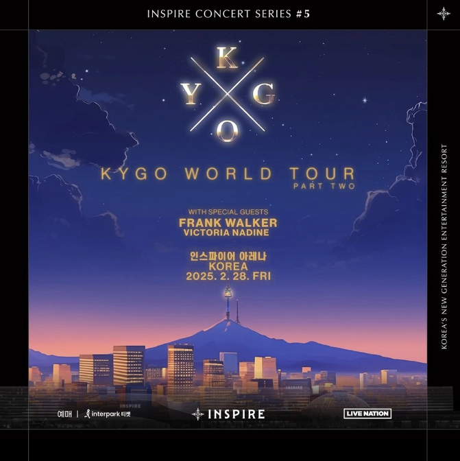 카이고 내한공연(INSPIRE CONCERT SERIES #5: KYGO)은 삼일절 연휴 대체공휴일의 시작인 2025년 2월 28일(금) 오후 9시 30분에 초대형파티 컨셉으로 관객만날 예정으로 샴페인 등 주류를 포함한 스페셜 패키지 판매를 검토 중이며, 편안하고 안전한 귀가를 위해 전용 셔틀버스도 준비될 예정이다.