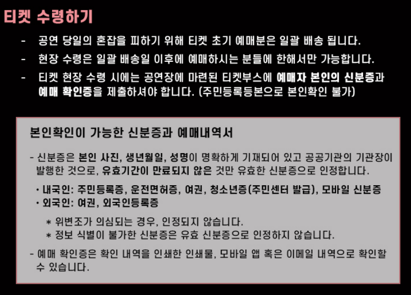 - 공연 당일 현장 교부처에서 예약번호 및 본인 확인 후 티켓을 수령하실 수 있습니다.