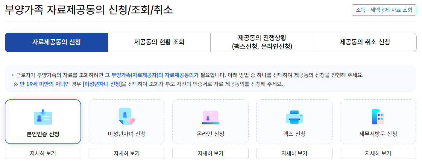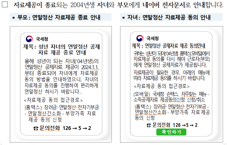 -동의가 없으면 자녀의 교육비 등이 누락될 수 있어 이를 예방하기 위해 부모와 자녀에게 자료제공이 종료 됨과 함께 자녀가 직접 동의해야 함을 모바일로 안내하였으니, 미리 동의하시기 바랍니다.