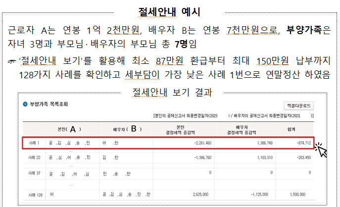 ✅근로자는 간소화자료를 활용해 예상세액을 계산할 수 있고, 맞벌이 부부간 자녀・부모님 등 부양가족 공제조합을 시뮬레이션하여 세금부담이 가장 낮은 경우를 선택하세요
