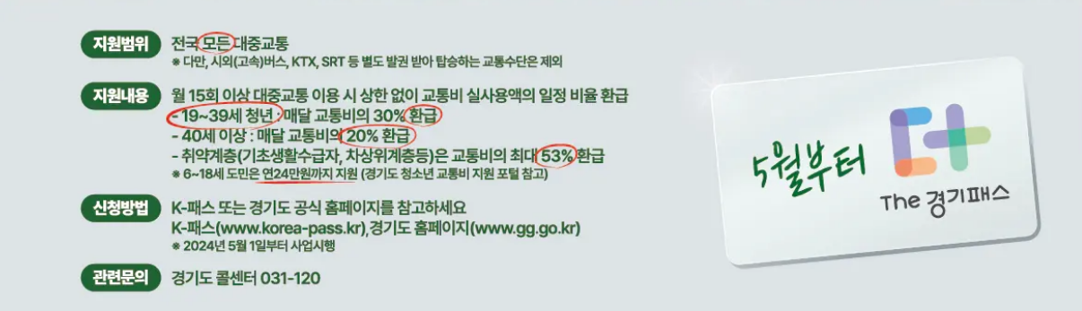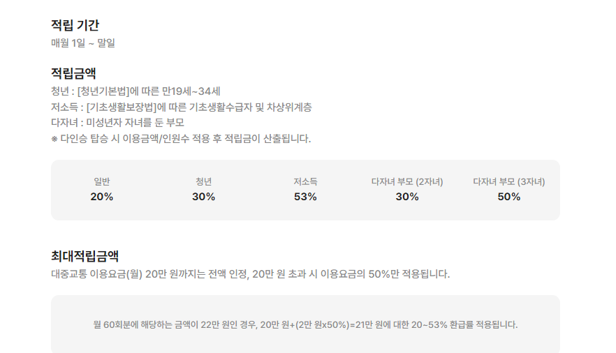 정부가 대중교통비의 일정 비율을 적립해 환급해주는 제도로 월 15회 이상(최대 60회 한도) 대중교통을 이용한 사람을 대상으로 교통비를 환급해 주는 사업이다.