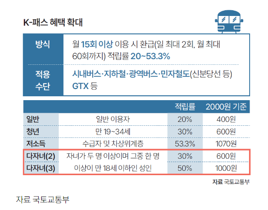 2025년 부터 k-패스 다자녀가구 유형 신설 3자녀 이상 50% 환급